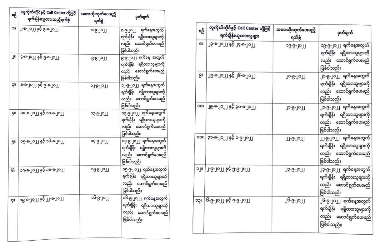 နိုင်ငံကူးလက်မှတ် အသစ်ပြုလုပ်ဖို့အတွက် အရင်ရက်တွေက ကိုယ်တိုင် လာရောက် ရက်ချိန်းတိုကင်ယူထားသူတွေ၊ Call Center ကနေ ရက်ချိန်းရယူထားပြီးသူတွေ အနေနဲ့ လာရောက်ရမဲ့ အချိန်ကို သံရုံးက ဇယားနဲ့ ဖော်ပြထားပါတယ်။