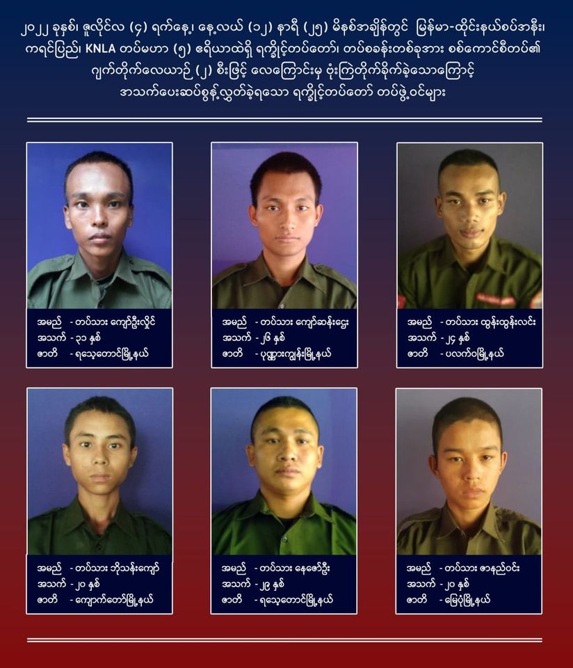 ထိုင်း-မြန်မာနယ်စပ် KNLA တပ်မဟာ ၅ ဧရိယာထဲမှာရှိတဲ့ ရက္ခိုင့်တပ်တော်(AA)ရဲ့တပ်စခန်းကို စစ်ကောင်စီတပ်တွေ မနေ့က လေကြောင်းနဲ့တိုက်ခိုက်ခဲ့မှုကြောင့် တပ်ဖွဲ့ဝင် ၆ ဦးကျဆုံးခဲ့တယ်လို့သတင်းထုတ်ပြန်ပါတယ်။