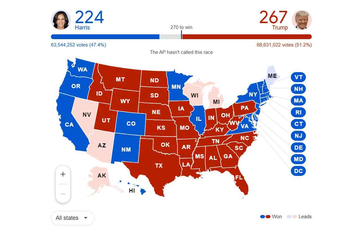 နိုဝင်ဘာလ ၆ ရက်နေ့ မြန်မာစံတော်ချိန် မွန်းလွဲ ၂ နာရီခွဲအချိန် မှာ ရီပတ်ဘလီကန်ပါတီ သမ္မတလောင်း ဒေါ်နယ်ထရမ့် က မဲရလဒ် ၂၆၇ မဲရရှိထားပြီ ဒီမိုကရက်တစ်ပါတီ သမ္မတလောင်း ကာမလာဟဲရစ်က ၂၂၄ မဲသာ ရရှိထားတယ်လို့ AP က ဖော်ပြထားပါတယ်။