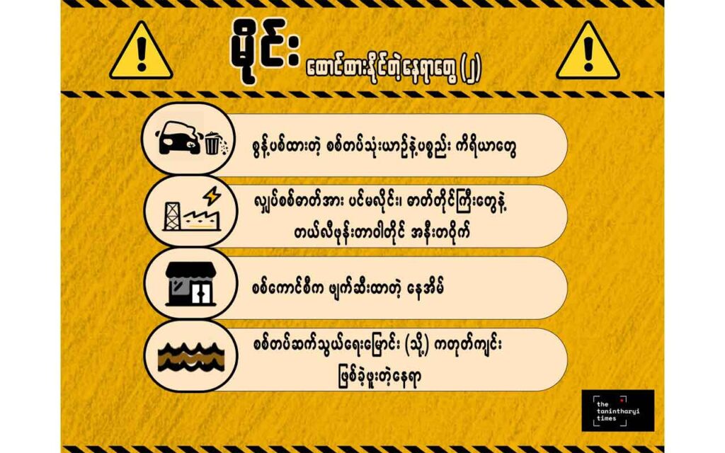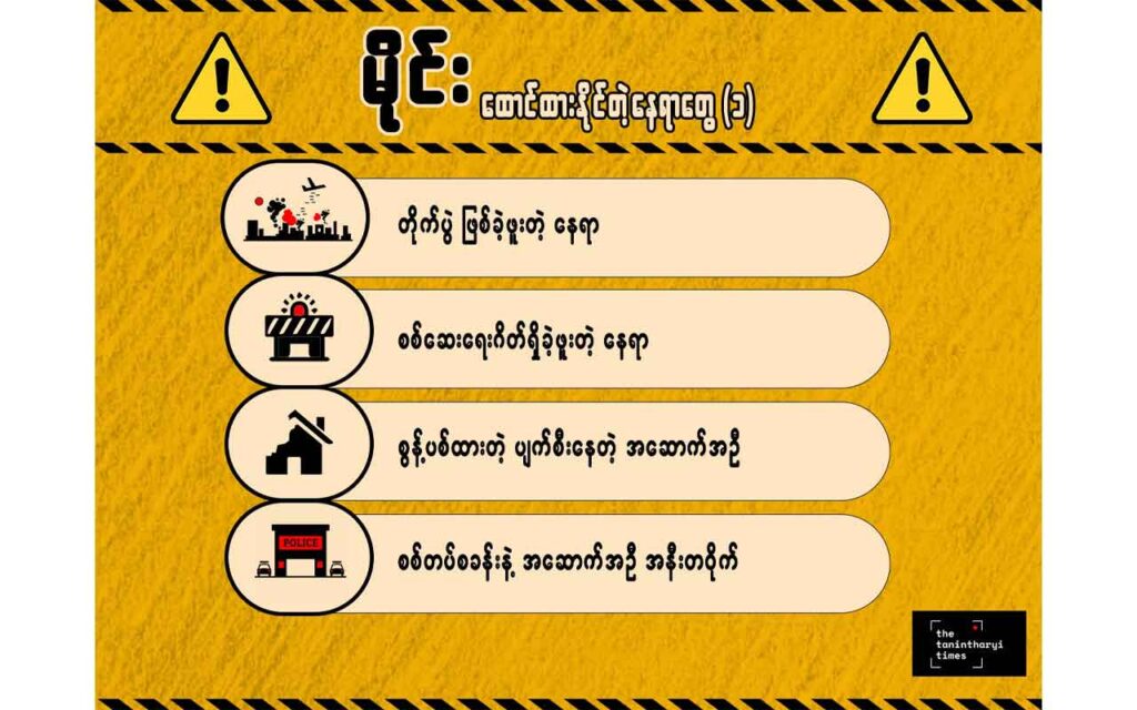 မြေမြှုပ်မိုင်းအန္တရာယ်ကို ကာကွယ်နိုင်ဖို့အတွက် ပြည်သူတွေအနေနဲ့ မိုင်းထောင်ထားနိုင်တဲ့ နေရာတွေကို ရှောင်ကွင်းသွားလာဖို့ လိုအပ်ပါတယ်။ ဘယ်နေရာတွေမှာ မိုင်းထောင်ထားလေ့ရှိပါသလဲ။ မိုင်းထောင်ထားနိုင်တဲ့နေရာတွေကို ဖော်ပြပေးလိုက်ပါတယ်။