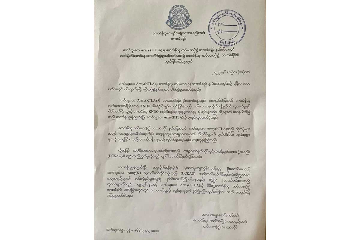ကော်သူးလေတပ်မတော် (KTLA)ကို ဘားအံခရိုင်နယ်မြေအတွင်း ခြေချခွင့်၊ လှုပ်ရှားခွင့် လုံးဝမပြုတော့ဘူးလို့ ကရင်အမျိုးသားအစည်းအရုံး KNU တပ်မဟာ (၇)ရဲ့ အလုပ်အမှုဆောင် ကော်မတီက စာထုတ်ပြန်ပါတယ်။