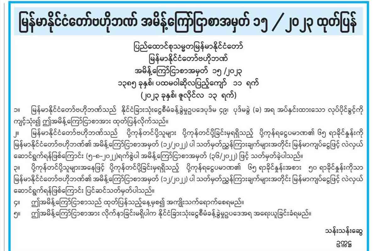 ထုတ်ပြန်ချက်အရ ပို့ကုန်လုပ်ငန်းရှင်တွေအနေနဲ့ ပို့ကုန်ရငွေရဲ့ ၅၀ ရာခိုင်နှုန်းကို ဗဟိုဘဏ်ရည်ညွှန်းဈေး ၂၁၀၀ ကျပ်နဲ့ မဖြစ်မနေ ရောင်းချရမှာဖြစ်ပြီး ကျန်တစ်ဝက်ကိုသာ ဈေးကွက်ပေါက်ဈေးအတိုင်း ရောင်းချရမှာပါ။