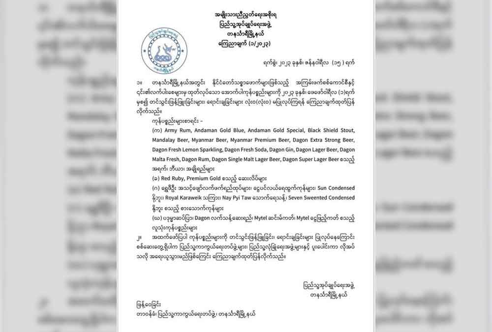 စစ်ကောင်စီနဲ့ သူတို့လက်ပါးစေတွေထုတ်လုပ်တဲ့ ကုန်ပစ္စည်းတွေ တင်သွန်းဖြန့်ဖြူးတာနဲ့ ရောင်းချတာတွေ့ရင် အရေးယူမယ်လို့ တနင်္သာရီ (ပ.အ.ဖ) ထုတ်ပြန်