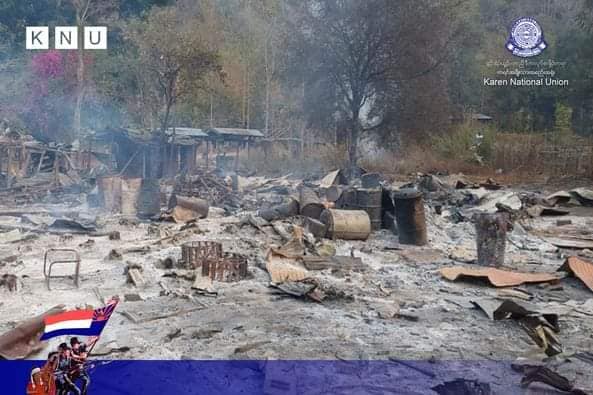 KNU တပ်မဟာ ၅နယ်မြေမှာ စစ်ကောင်စီတပ် လေကြောင်းကနေ ဗုံးကြဲလို့ ကျေးရွာတွေက စာသင်ကျောင်းတွေအပါအဝင် လူနေအိမ်အများအပြား မီးလောင်ပျက်စီး