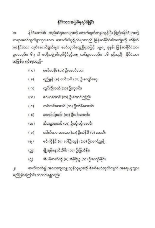 စစ်ကောင်စီက NUG အစိုးရအဖွဲ့ဝင် အချို့ အပါအဝင် စုစုပေါင်း (၁၁)ဦးကို နိုင်ငံသားအဖြစ်ကနေ ရပ်စဲတယ်လို့ ဒီနေ့ ထုတ်ပြန်ကြေညာပါတယ်။