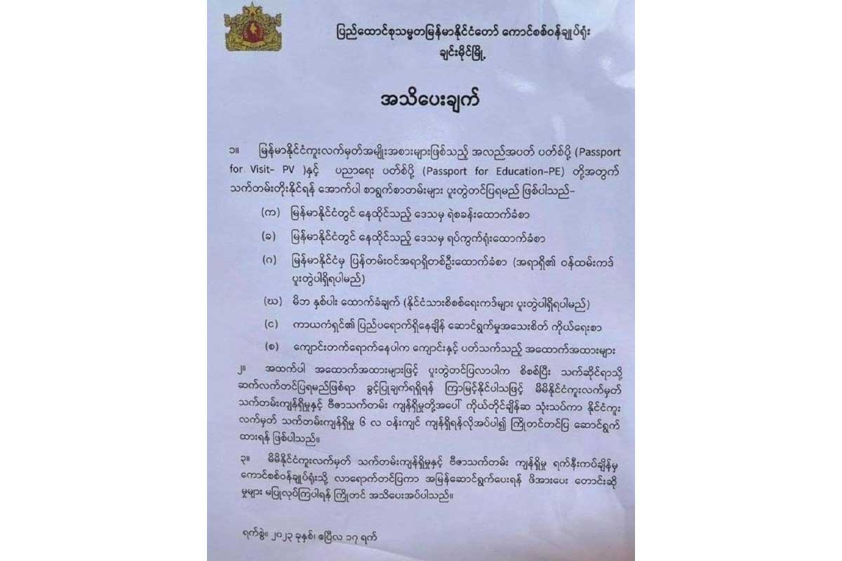 အခုလ ၁၇ ရက် ရက်စွဲနဲ့ ထုတ်ထားတဲ့ အဲဒီထုတ်ပြန်ချက်ထဲမှာ အလည်အပတ်ပတ်စ်ပို့နဲ့ ပညာရေးပတ်စ်ပို့တွေ သက်တမ်းတိုးချိန် လုပ်ဆောင်ရမယ့် ကန့်သန့်ချက်တွေ တင်ပြရမယ့်အရာတွေကို ရေးသားထားပါတယ်။