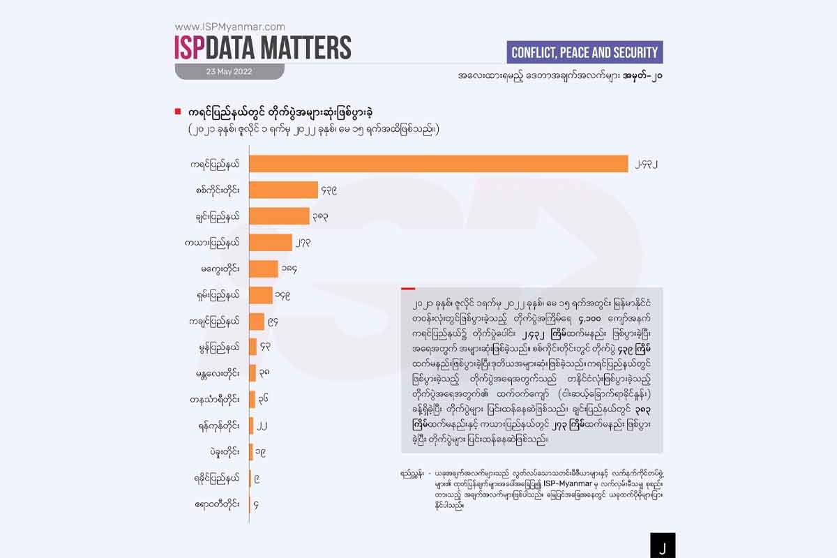 ISP-Myanmar က လက်လှမ်းမီသမျှ စုဆောင်းထားတဲ့ အချက်အလက်တွေအရ ကရင်ပြည်နယ်အတွင်းမှာ တိုက်ပွဲ ၂,၄၃၂ကြိမ် ထက်မနည်း ဖြစ်ပွါးခဲ့ပြီး၊ စစ်ကိုင်းတိုင်းမှာတော့ ၄၃၉ ကြိမ်ထက် မနည်းဖြစ်ပွါးခဲ့ပါတယ်။