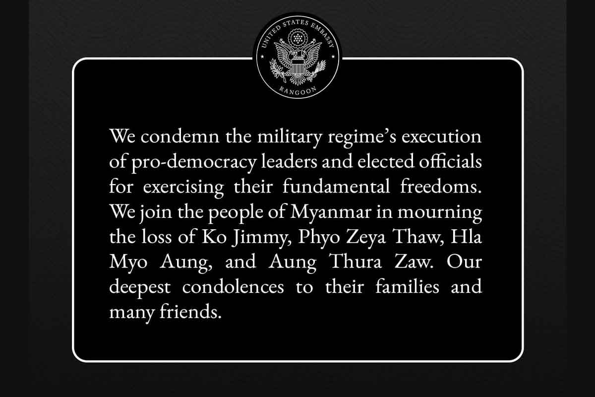 “ဒီမိုကရေစီခေါင်းဆောင်နဲ့ ရွေးကောက်ခံ ကိုယ်စားလှယ်ကို သူတို့ရဲ့ အခြေခံလွတ်လပ်ခွင့်တွေ ကျင့်သုံးတဲ့အတွက် စစ်အစိုးရက ကွပ်မျက်ခြင်းကို ကျွန်ုပ်တို့ ရှုတ်ချပါတယ်။ ဆုံးရှုံးမှုအတွက် မြန်မာပြည်သူတွေနဲ့ အတူ ဝမ်းနည်းကြေကွဲရပါတယ်” လို့ မြန်မာနိုင်ငံဆိုင်ရာ အမေရိကန် သံရုံးက ထုတ်ပြန်ပါတယ်။