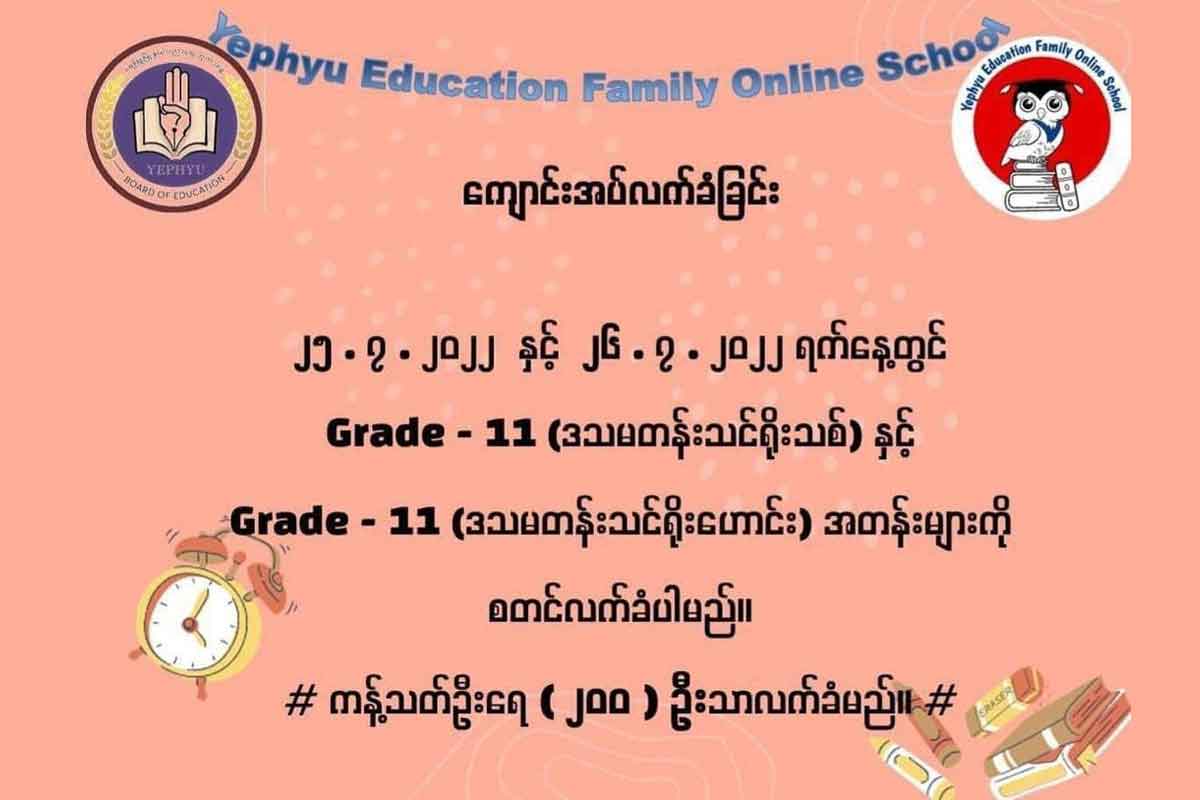ပြည်သူ့ပညာရေးကျောင်းတစ်ကျောင်းဖြစ်တဲ့ Yephyu Education Family Online School က Grade 11 (ဒသမတန်း သင်ရိုသစ်/ သင်ရိုးဟောင်း) အတန်းအတွက် ကျောင်းသား ၂၀၀ ကိုလက်ခံသွားမယ်လို့ ရေဖြူမြို့နယ်ပညာရေးဘုတ်အဖွဲ့ – ယာယီက ကြေညာထားပါတယ်။